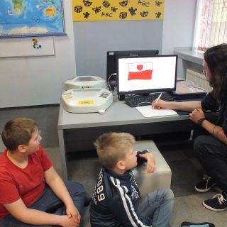Uczestnicy warsztatów na zajęciach graficznych szukali podobieństwa i różnic polskich symboli narodowych miedzy flagą, banderą...